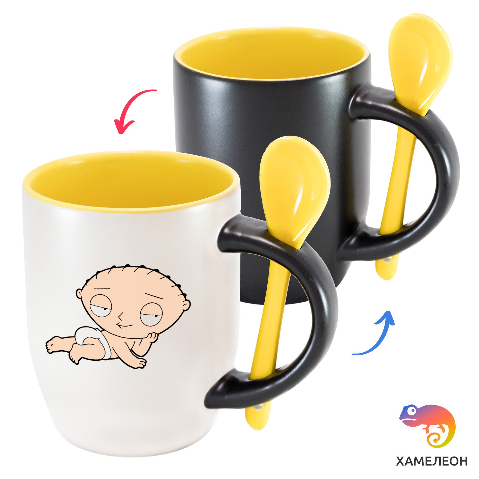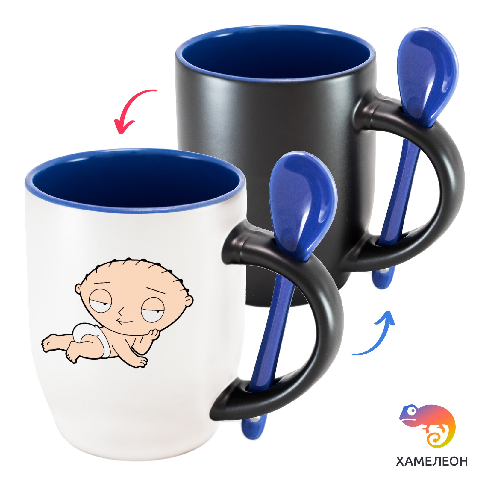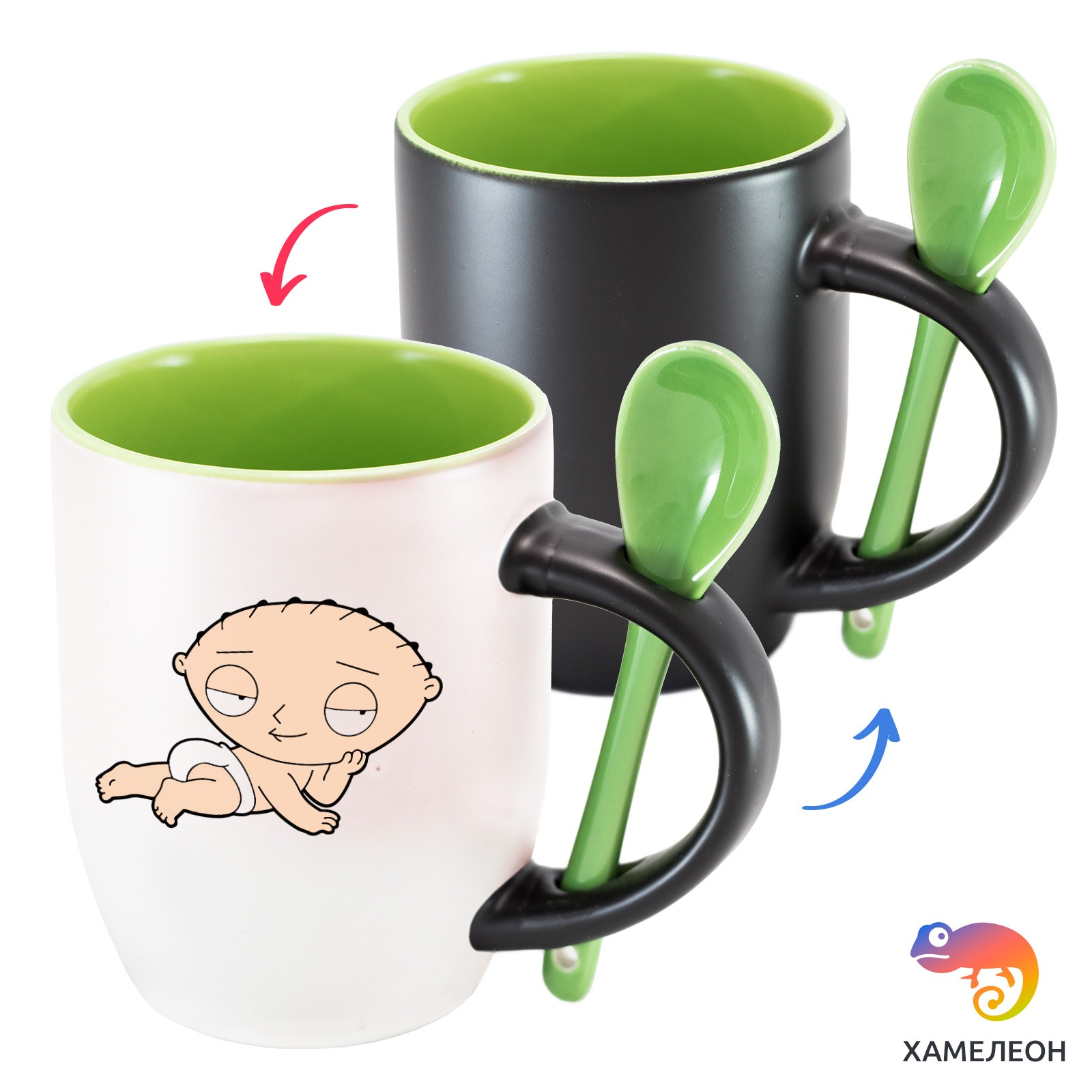 Кружка с принтом является отличным подарком коллеге, другу или самому себе ?Оригинальная кружка хамелеон Stewie Griffin в подгузнике, с ложкой, приукрасит ваши будни или станет отличным подарком. Кружка изготовлена из высококачественной керамики, а специальный термопегментный слой позволяет ей менять цвет, в зависимости от температуры. Изначально кружка имеет черную заливку, которая становится белой, когда вы наливаете кипяток. Термопегменты становятся прозрачными, начиная с 50°C. Под черным пегментным слоем скрываются необычные рисунки, которые удивят многих.