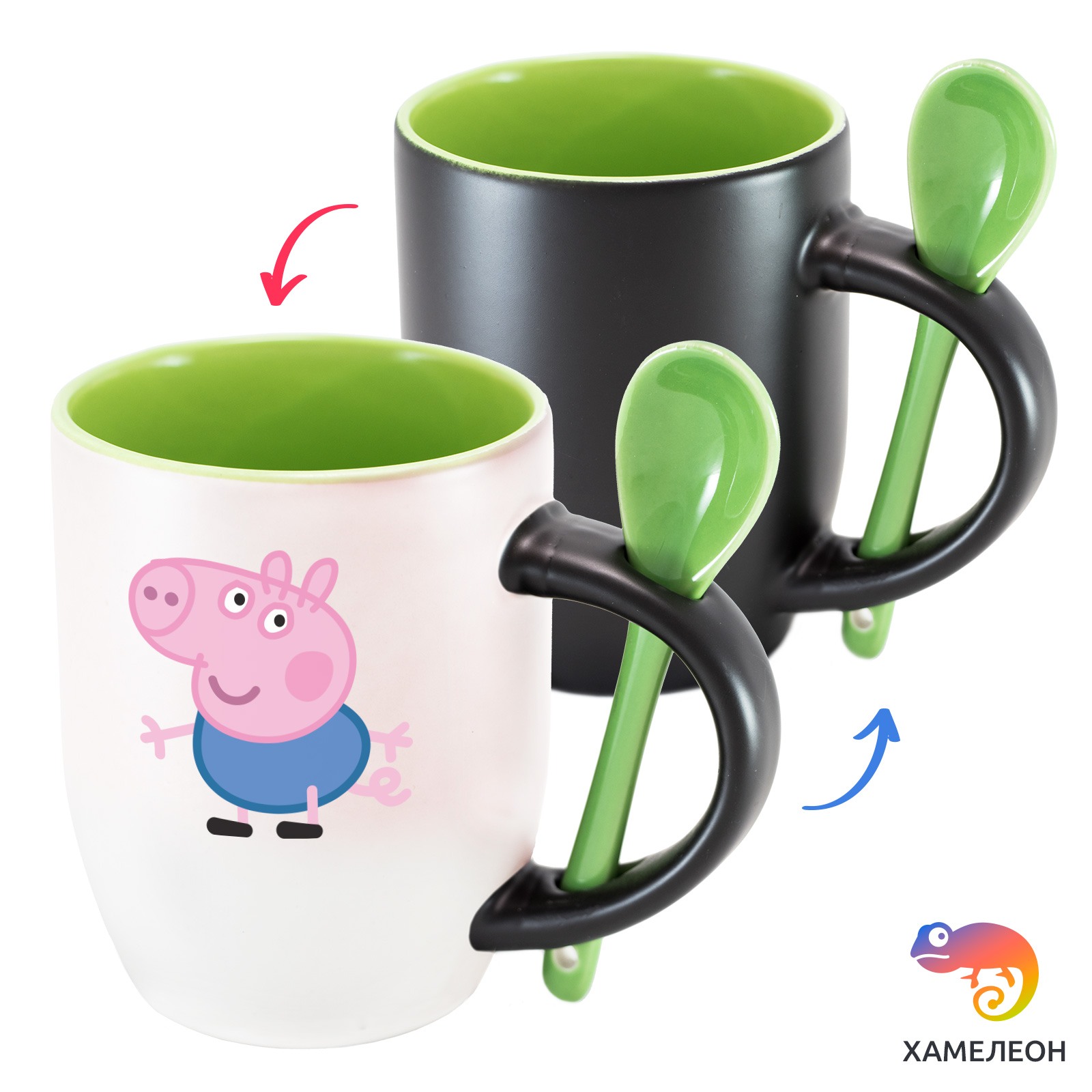 Кружка с принтом является отличным подарком коллеге, другу или самому себе ?Оригинальная кружка хамелеон Свинка Джордж с ложкой приукрасит ваши будни или станет отличным подарком. Кружка изготовлена из высококачественной керамики, а специальный термопегментный слой позволяет ей менять цвет, в зависимости от температуры. Изначально кружка имеет черную заливку, которая становится белой, когда вы наливаете кипяток. Термопегменты становятся прозрачными, начиная с 50°C. Под черным пегментным слоем скрываются необычные рисунки, которые удивят многих.