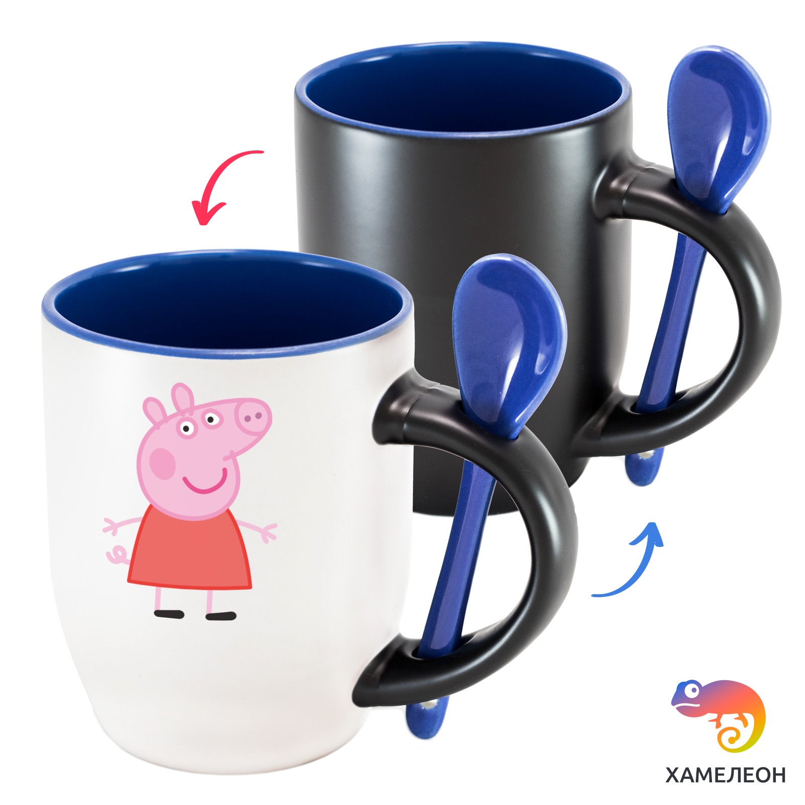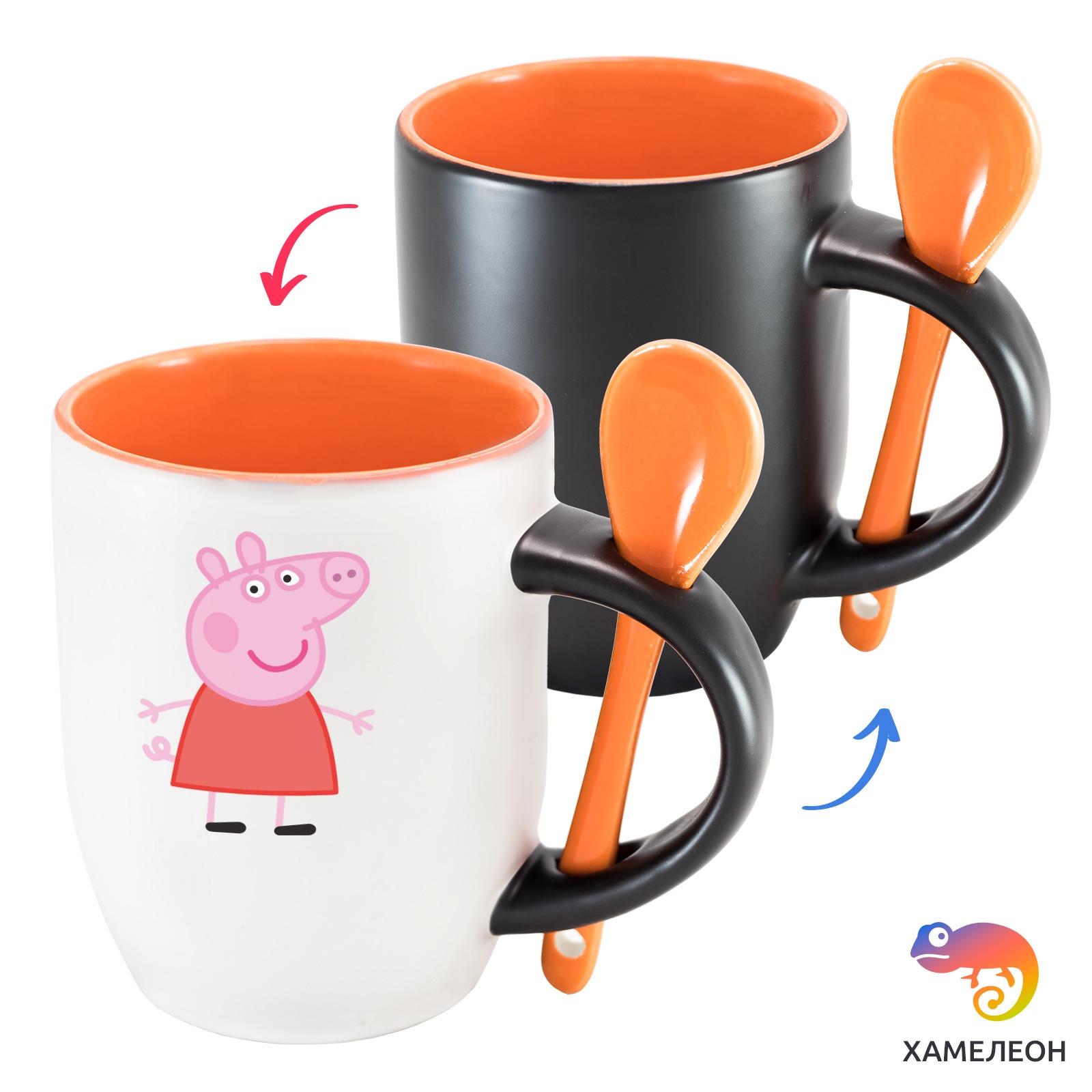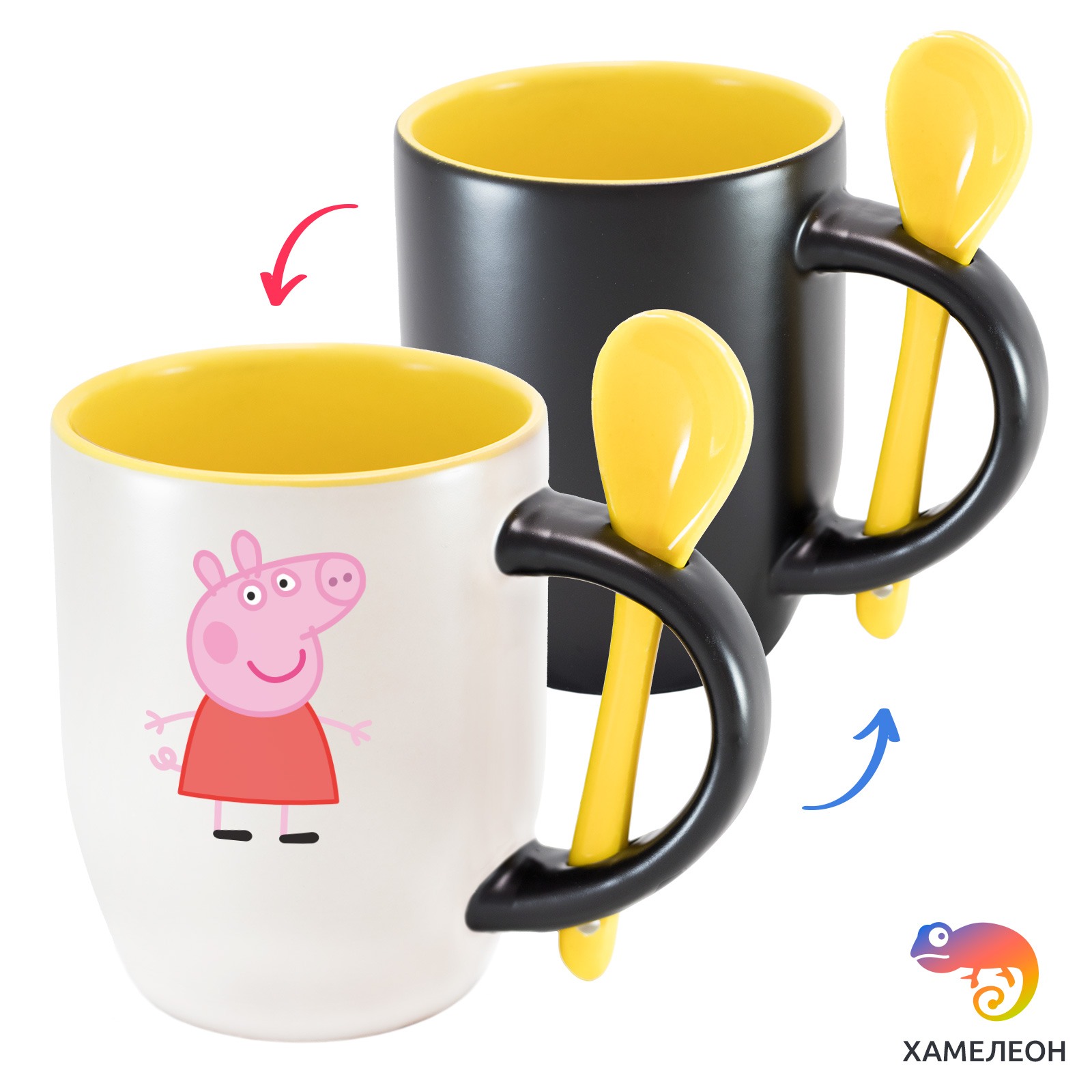 Кружка с принтом является отличным подарком коллеге, другу или самому себе ?Оригинальная кружка хамелеон Свинка Пеппа с ложкой приукрасит ваши будни или станет отличным подарком. Кружка изготовлена из высококачественной керамики, а специальный термопегментный слой позволяет ей менять цвет, в зависимости от температуры. Изначально кружка имеет черную заливку, которая становится белой, когда вы наливаете кипяток. Термопегменты становятся прозрачными, начиная с 50°C. Под черным пегментным слоем скрываются необычные рисунки, которые удивят многих.