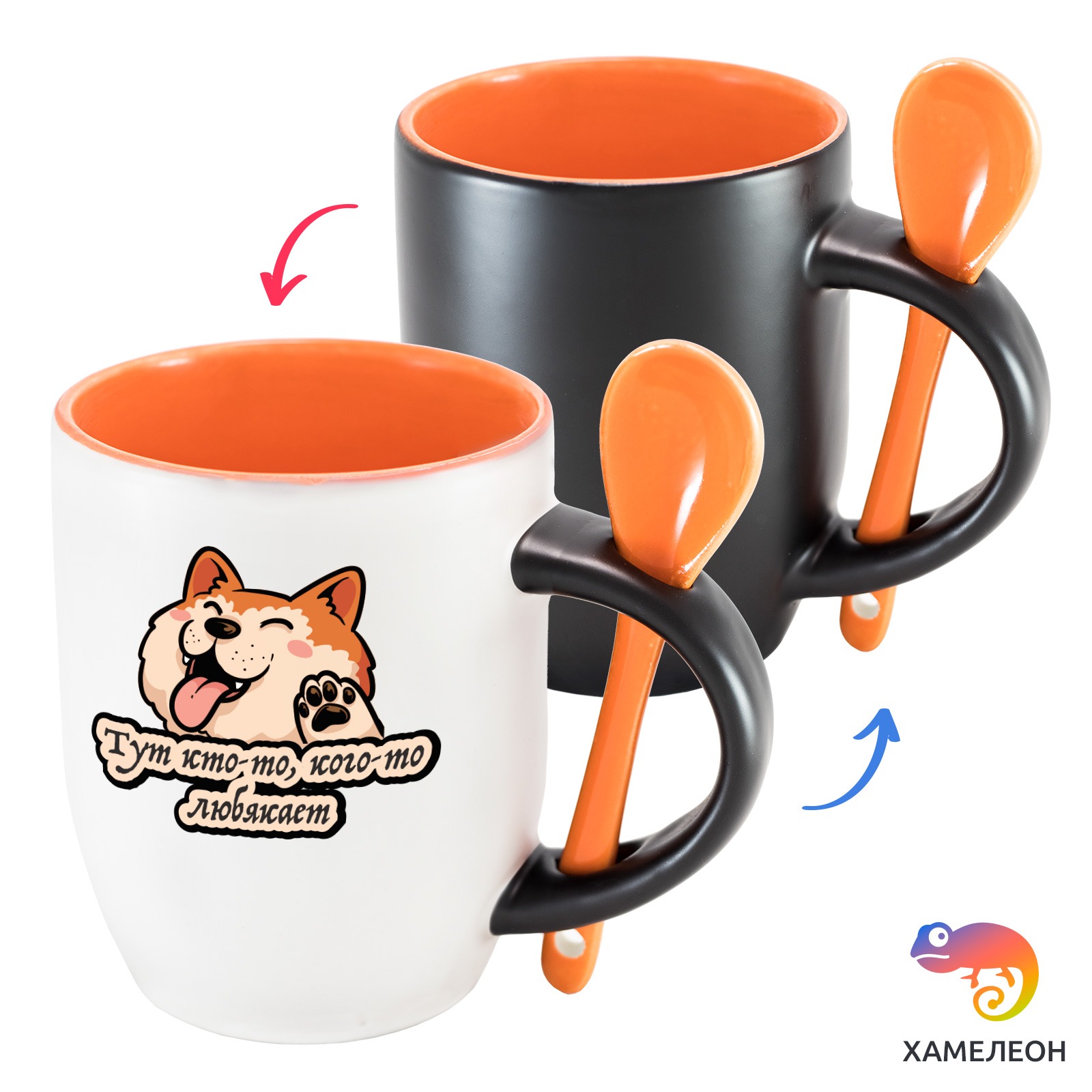 Кружка с принтом является отличным подарком коллеге, другу или самому себе ?Оригинальная кружка хамелеон «Тут кто-то, кого-то любякает» с ложкой приукрасит ваши будни или станет отличным подарком. Кружка изготовлена из высококачественной керамики, а специальный термопегментный слой позволяет ей менять цвет, в зависимости от температуры. Изначально кружка имеет черную заливку, которая становится белой, когда вы наливаете кипяток. Термопегменты становятся прозрачными, начиная с 50°C. Под черным пегментным слоем скрываются необычные рисунки, которые удивят многих.