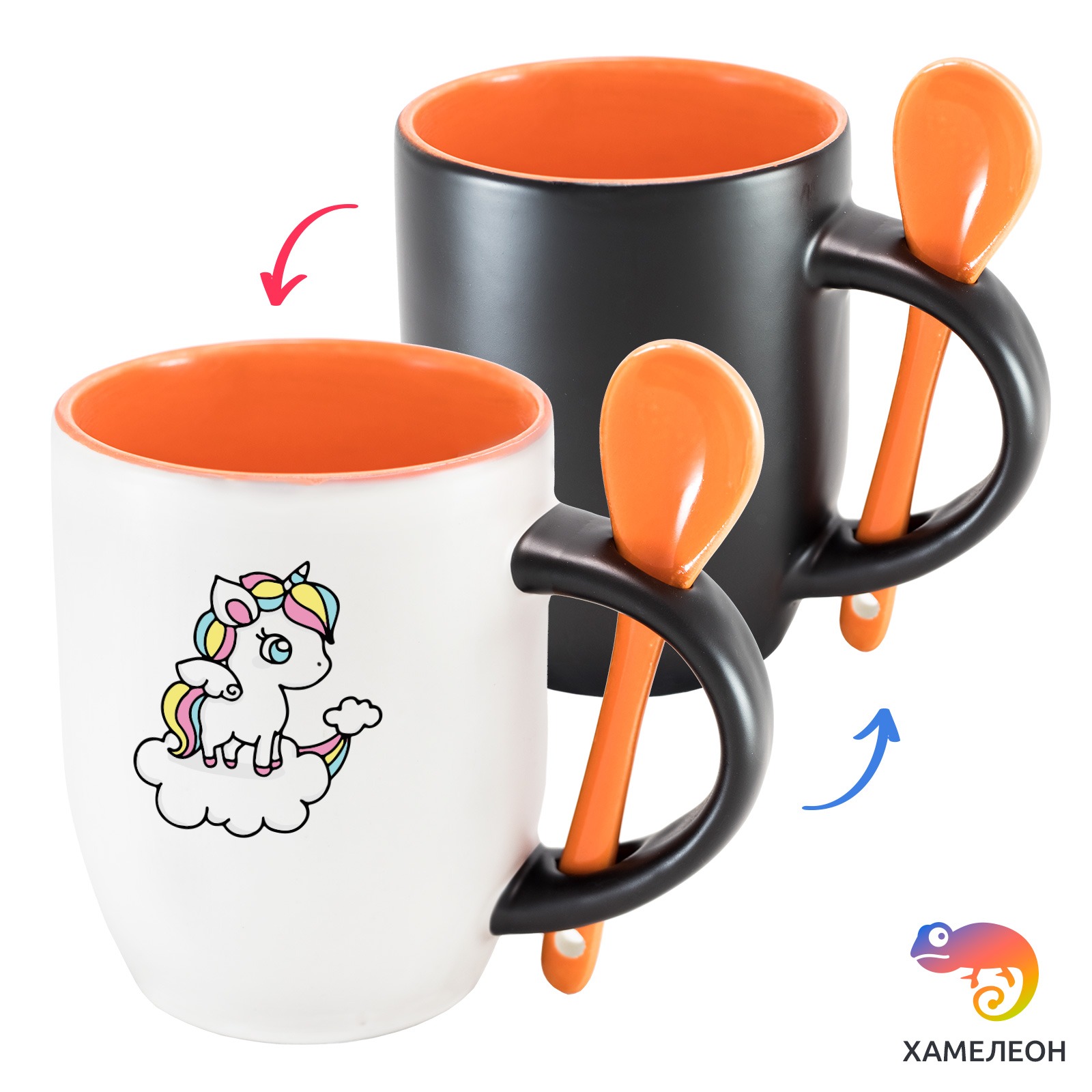 Кружка с принтом является отличным подарком коллеге, другу или самому себе ?Оригинальная кружка хамелеон Unicorn on sky ложкой приукрасит ваши будни или станет отличным подарком. Кружка изготовлена из высококачественной керамики, а специальный термопегментный слой позволяет ей менять цвет, в зависимости от температуры. Изначально кружка имеет черную заливку, которая становится белой, когда вы наливаете кипяток. Термопегменты становятся прозрачными, начиная с 50°C. Под черным пегментным слоем скрываются необычные рисунки, которые удивят многих.