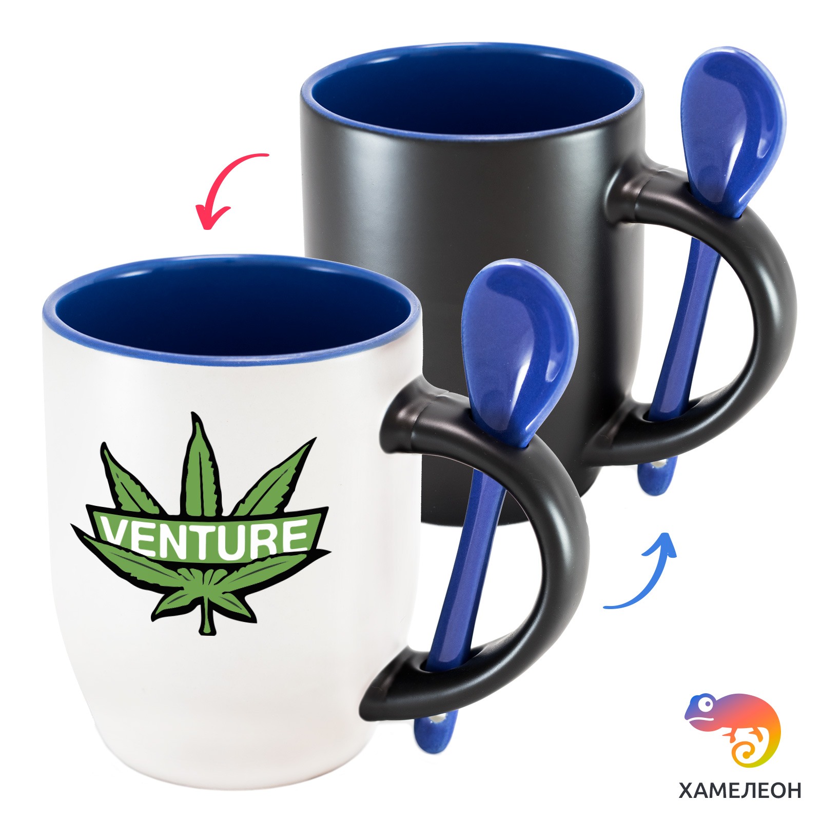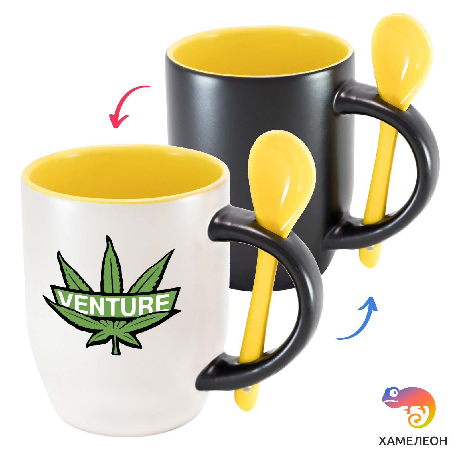 Кружка с принтом является отличным подарком коллеге, другу или самому себе ?Оригинальная кружка хамелеон Venture с ложкой приукрасит ваши будни или станет отличным подарком. Кружка изготовлена из высококачественной керамики, а специальный термопегментный слой позволяет ей менять цвет, в зависимости от температуры. Изначально кружка имеет черную заливку, которая становится белой, когда вы наливаете кипяток. Термопегменты становятся прозрачными, начиная с 50°C. Под черным пегментным слоем скрываются необычные рисунки, которые удивят многих.