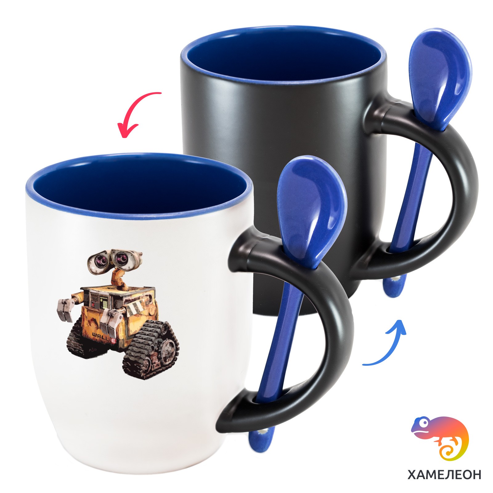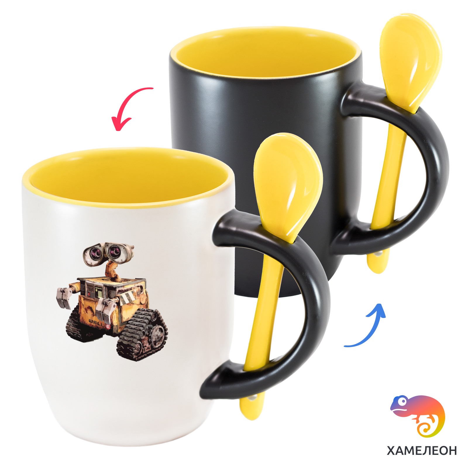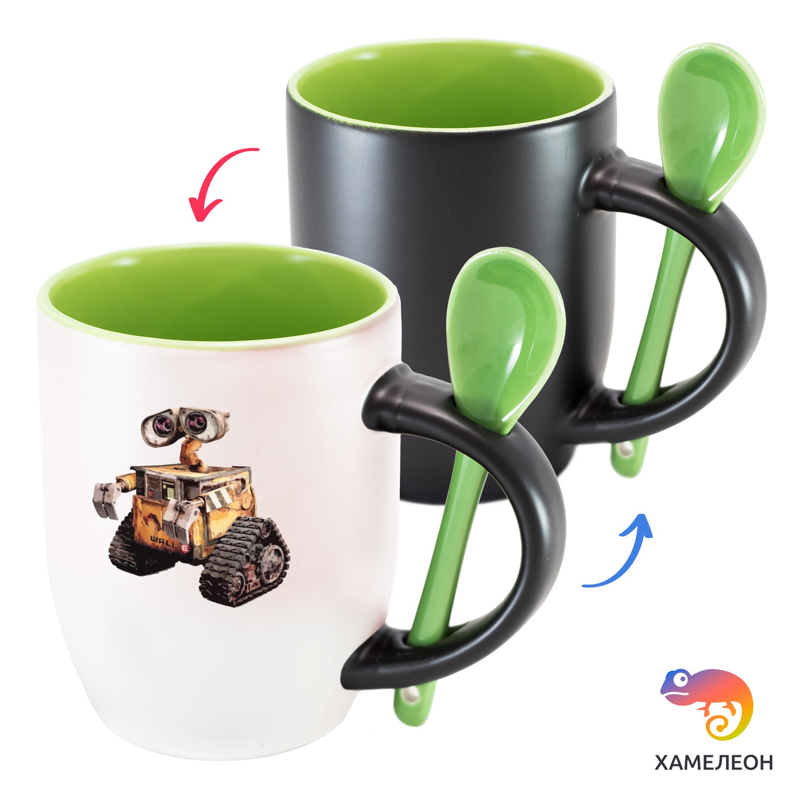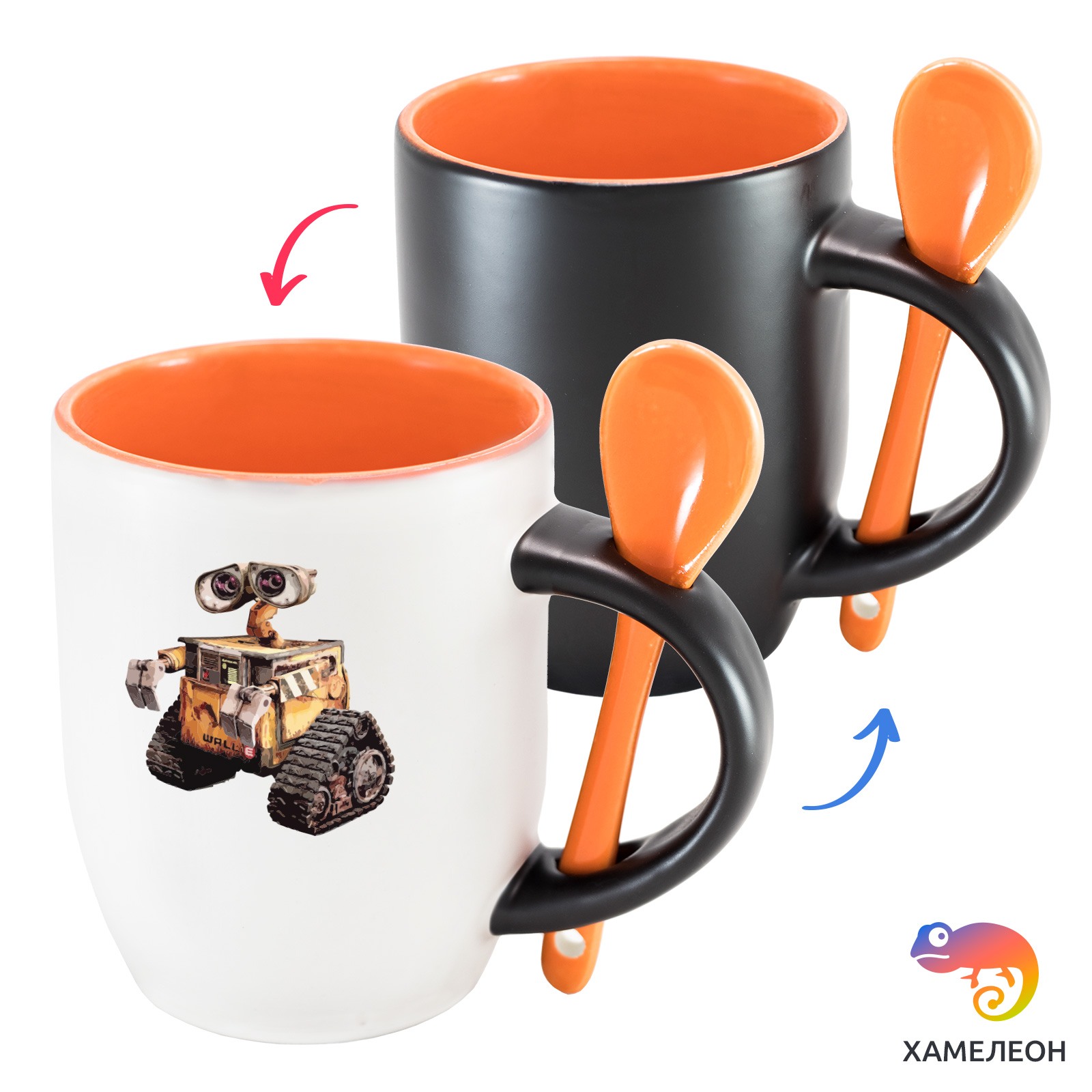 Кружка с принтом является отличным подарком коллеге, другу или самому себе ?Оригинальная кружка хамелеон WALL-E с ложкой приукрасит ваши будни или станет отличным подарком. Кружка изготовлена из высококачественной керамики, а специальный термопегментный слой позволяет ей менять цвет, в зависимости от температуры. Изначально кружка имеет черную заливку, которая становится белой, когда вы наливаете кипяток. Термопегменты становятся прозрачными, начиная с 50°C. Под черным пегментным слоем скрываются необычные рисунки, которые удивят многих.