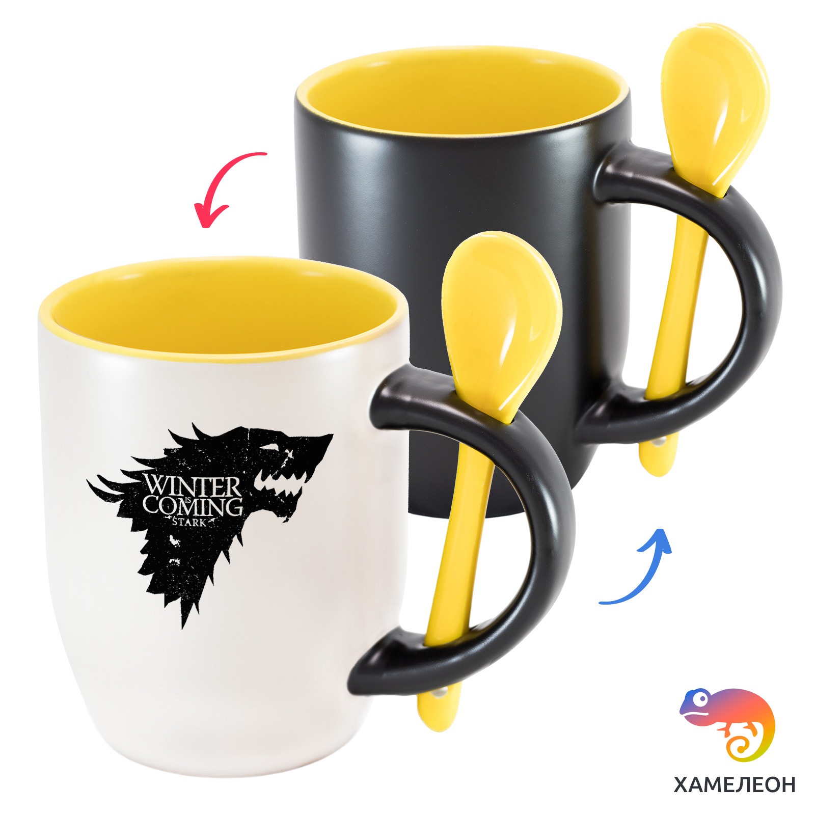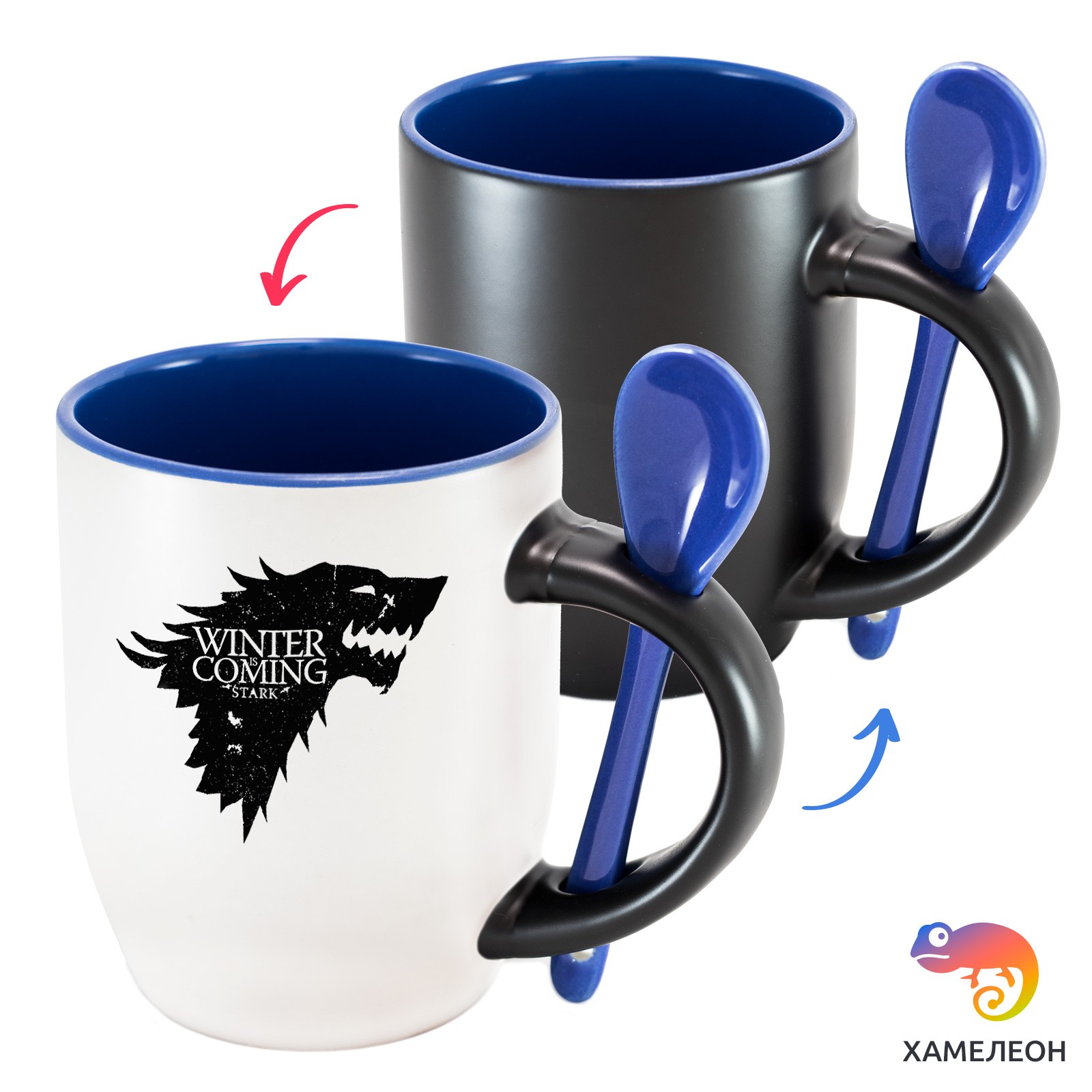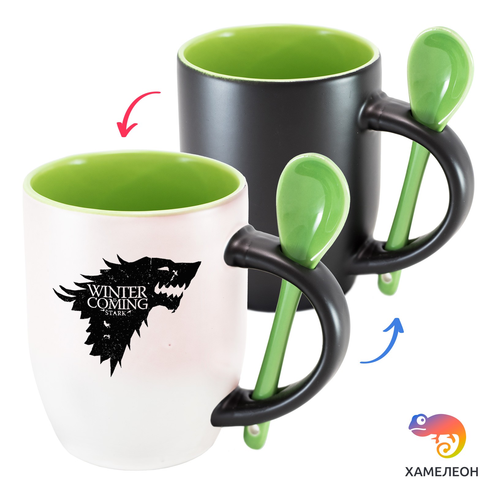 Кружка с принтом является отличным подарком коллеге, другу или самому себе ?Оригинальная кружка хамелеон Winter is Coming с ложкой приукрасит ваши будни или станет отличным подарком. Кружка изготовлена из высококачественной керамики, а специальный термопегментный слой позволяет ей менять цвет, в зависимости от температуры. Изначально кружка имеет черную заливку, которая становится белой, когда вы наливаете кипяток. Термопегменты становятся прозрачными, начиная с 50°C. Под черным пегментным слоем скрываются необычные рисунки, которые удивят многих.