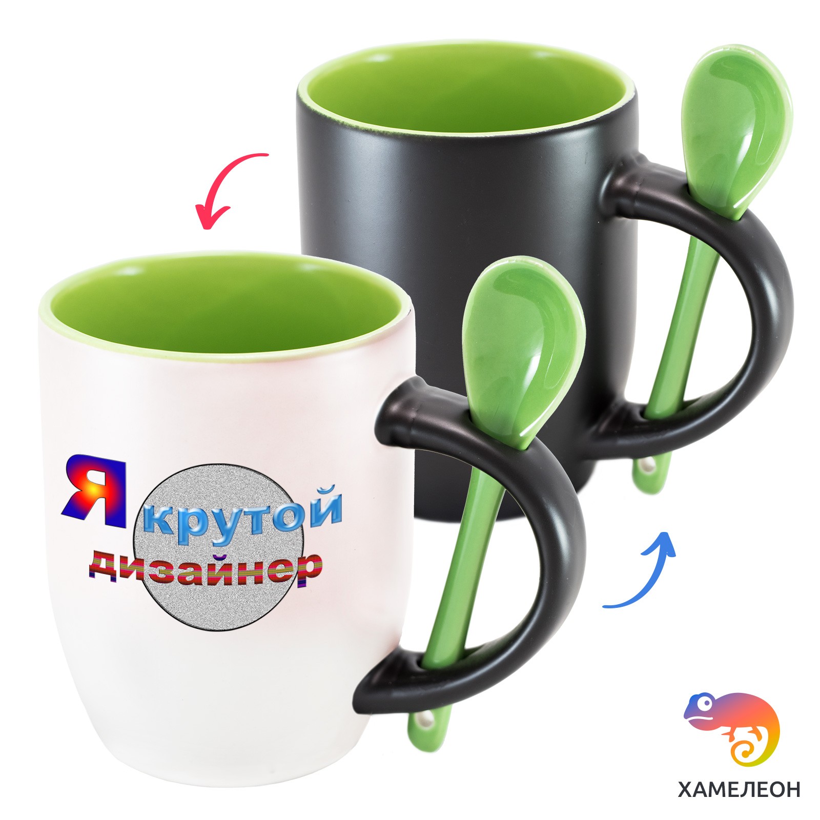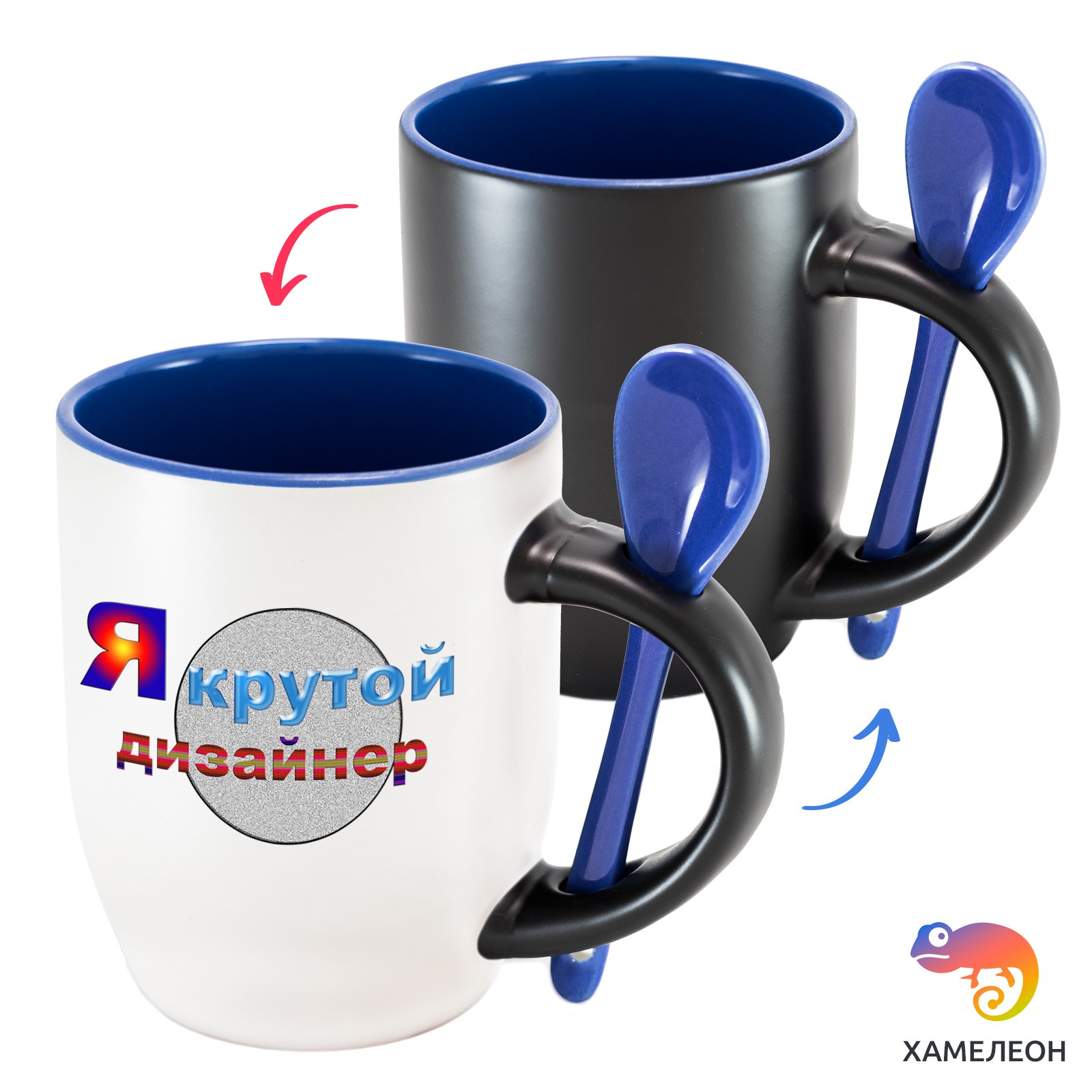 Кружка с принтом является отличным подарком коллеге, другу или самому себе ?Оригинальная кружка хамелеон «Я крутой дизайнер» с ложкой приукрасит ваши будни или станет отличным подарком. Кружка изготовлена из высококачественной керамики, а специальный термопегментный слой позволяет ей менять цвет, в зависимости от температуры. Изначально кружка имеет черную заливку, которая становится белой, когда вы наливаете кипяток. Термопегменты становятся прозрачными, начиная с 50°C. Под черным пегментным слоем скрываются необычные рисунки, которые удивят многих.