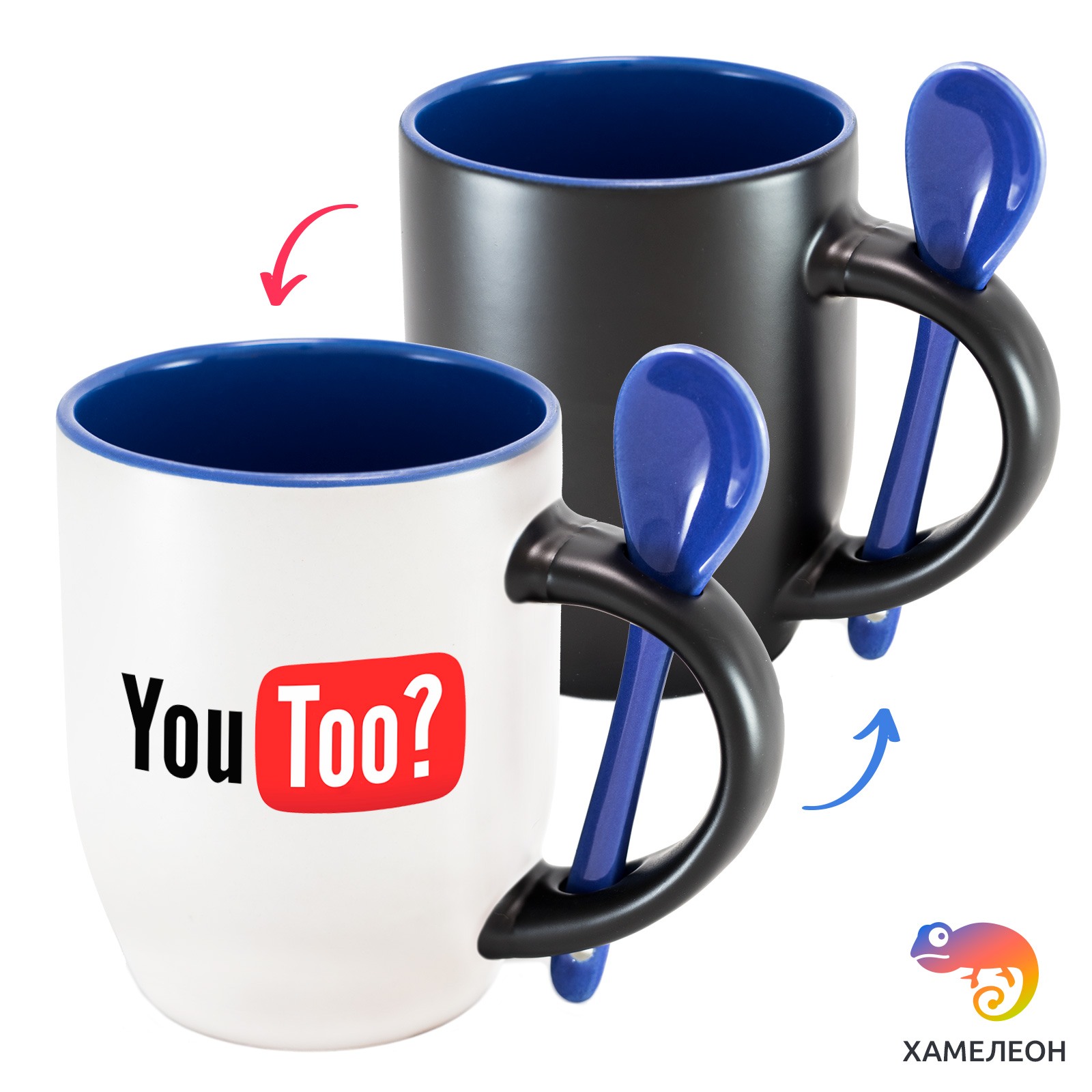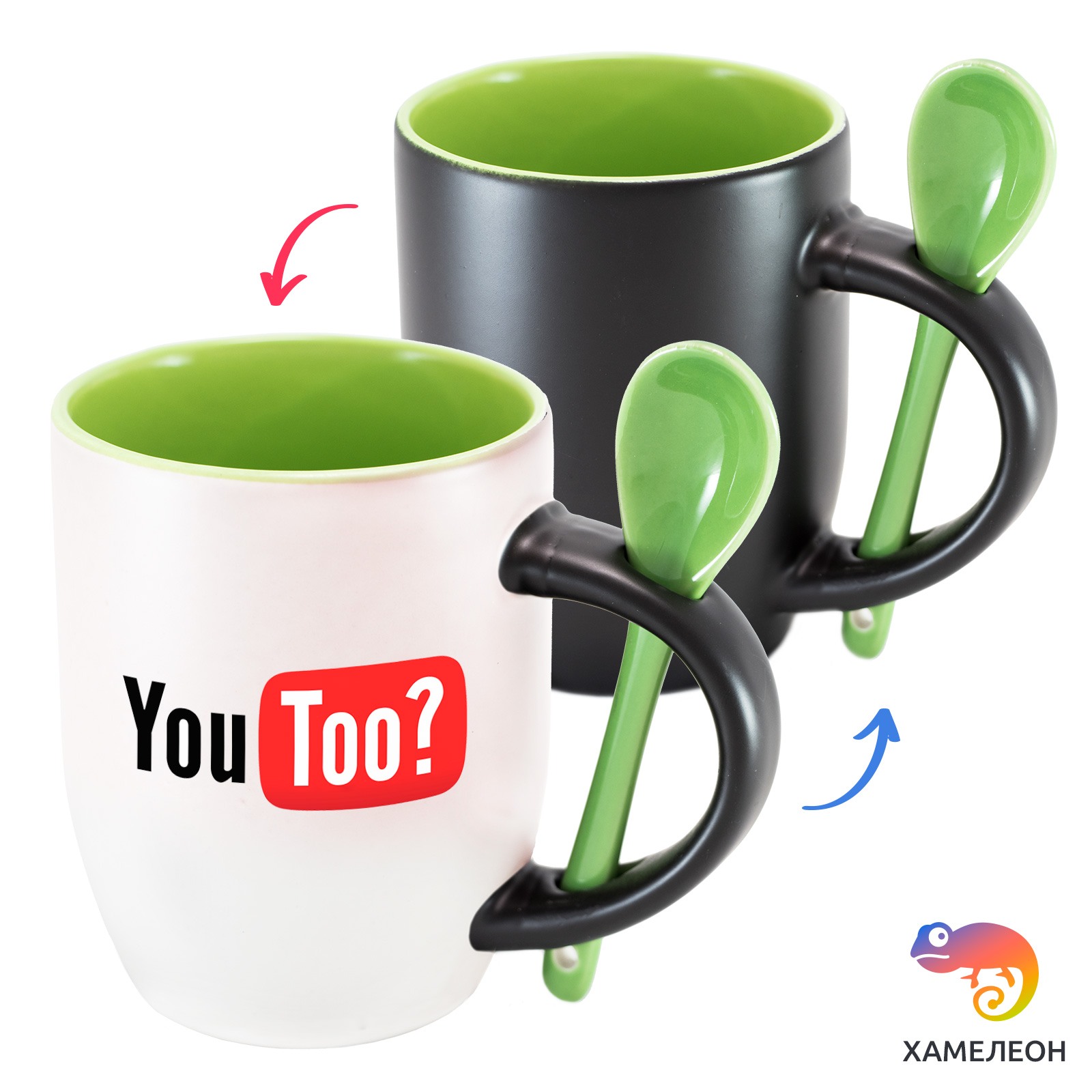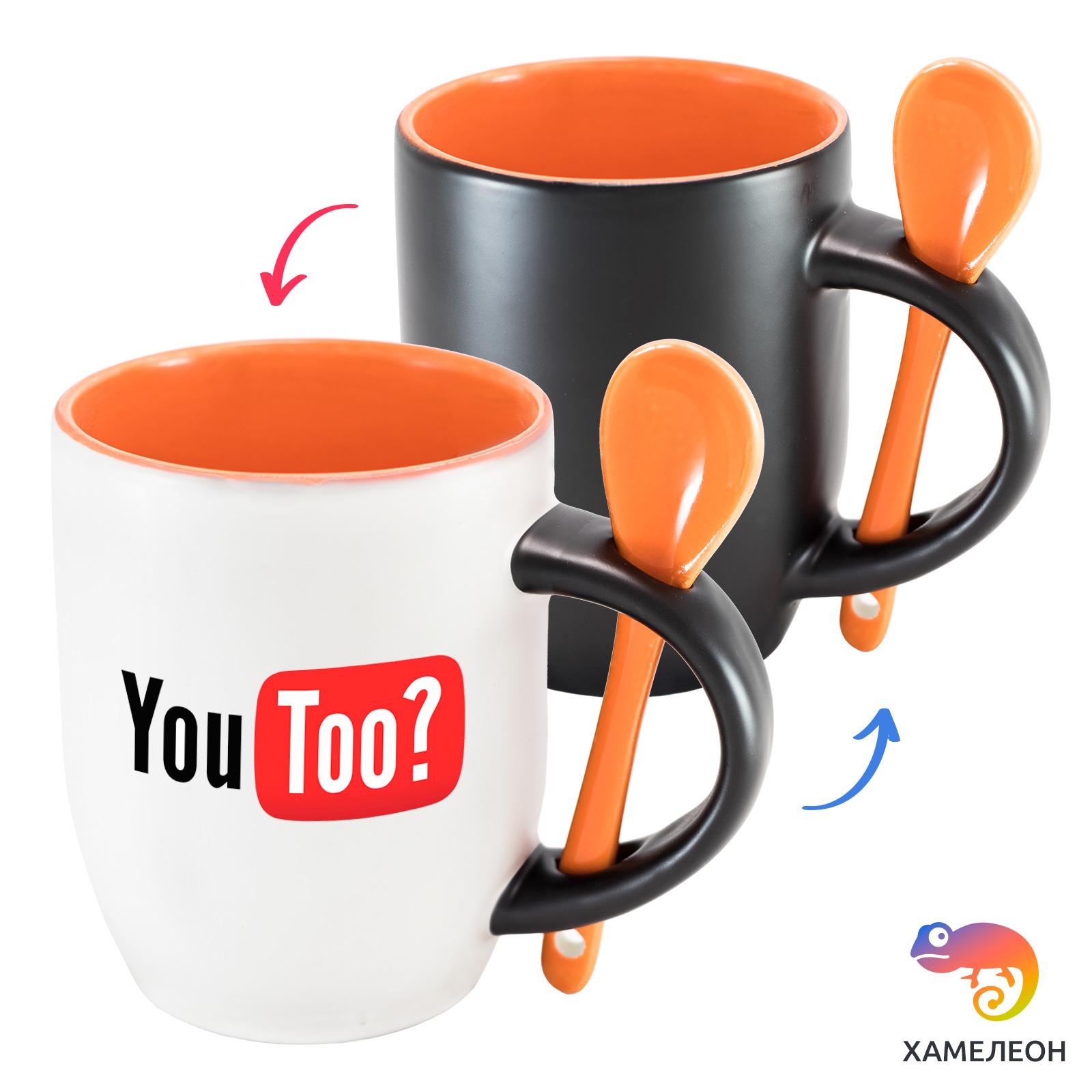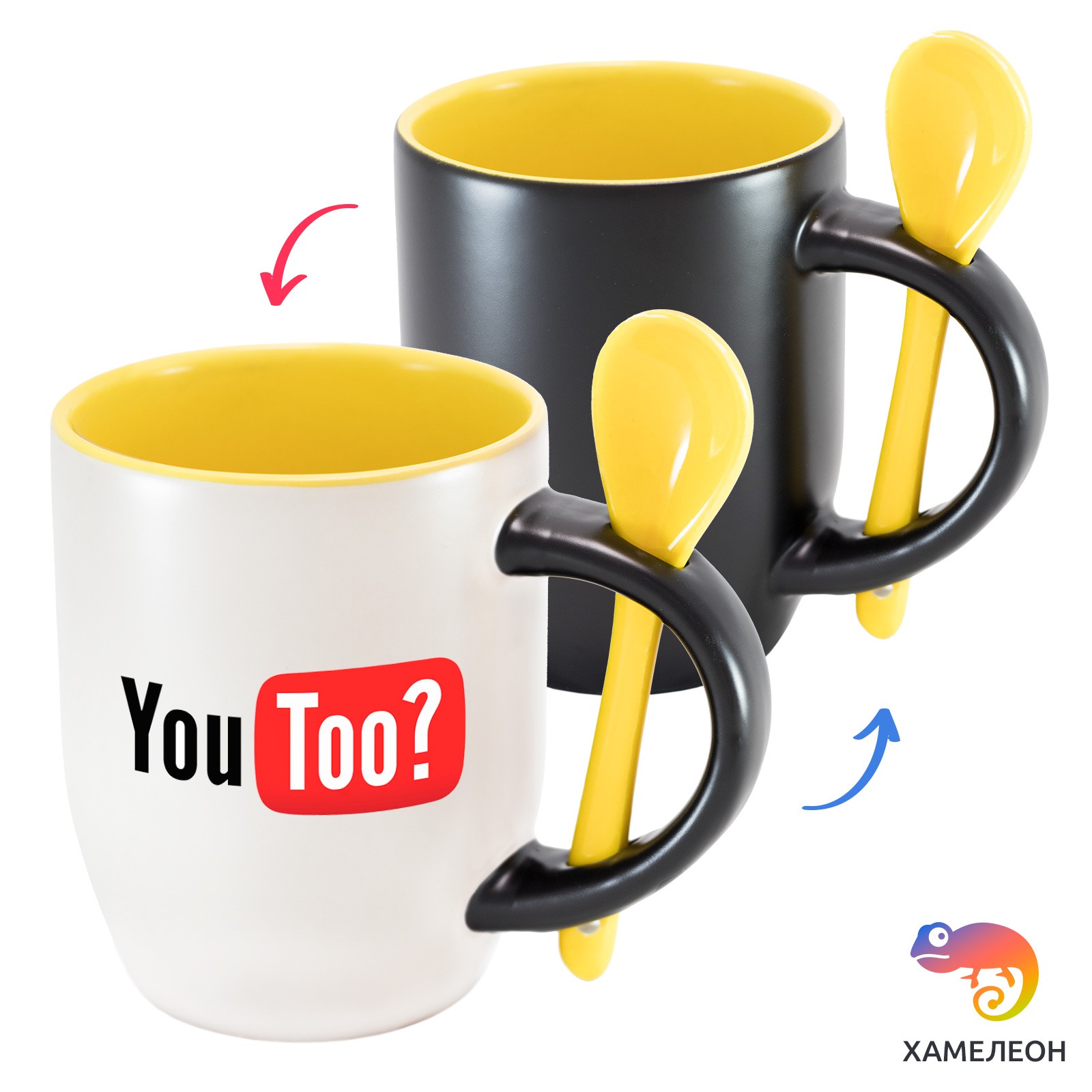 Кружка с принтом является отличным подарком коллеге, другу или самому себе ?Оригинальная кружка хамелеон «You Too?» с ложкой приукрасит ваши будни или станет отличным подарком. Кружка изготовлена из высококачественной керамики, а специальный термопегментный слой позволяет ей менять цвет, в зависимости от температуры. Изначально кружка имеет черную заливку, которая становится белой, когда вы наливаете кипяток. Термопегменты становятся прозрачными, начиная с 50°C. Под черным пегментным слоем скрываются необычные рисунки, которые удивят многих.