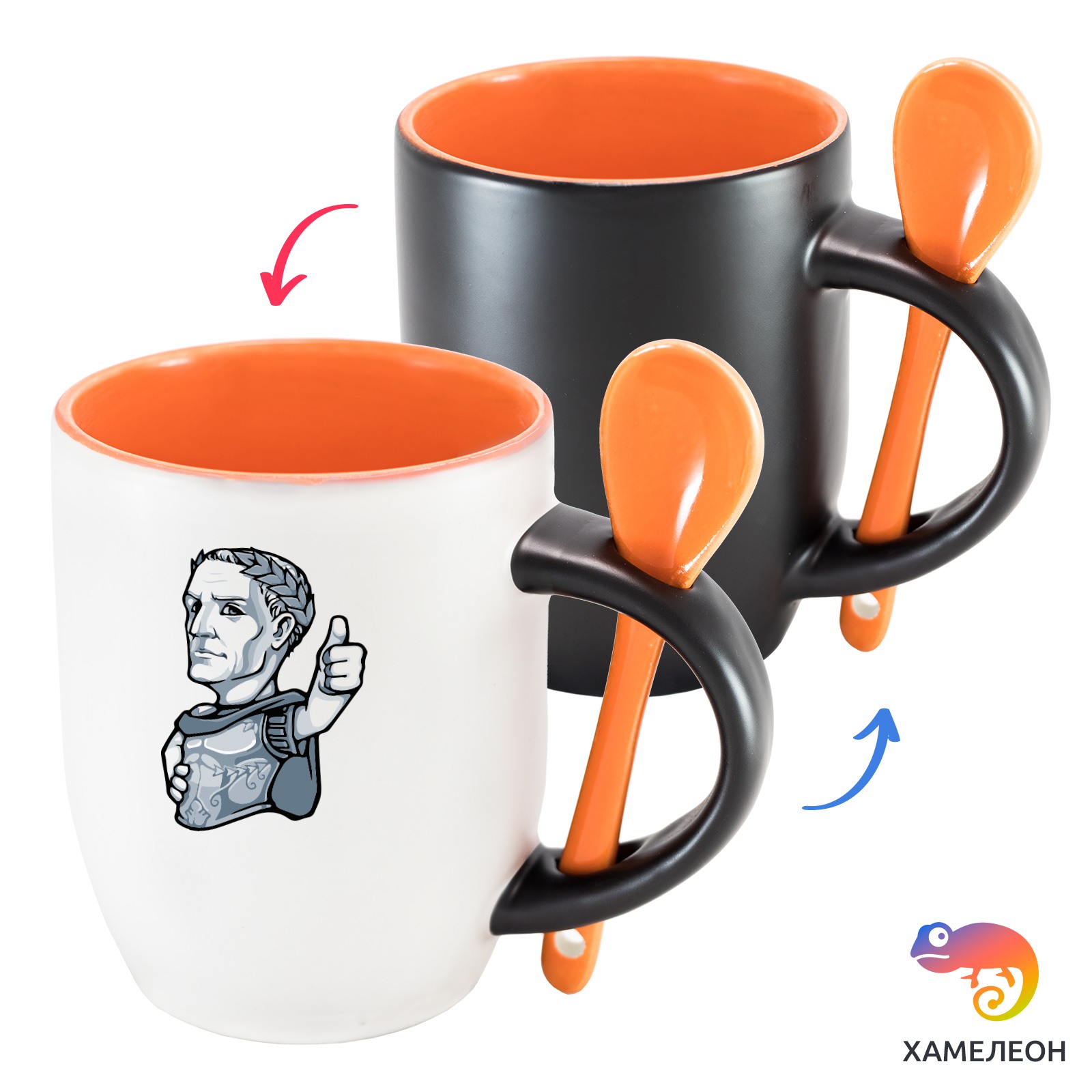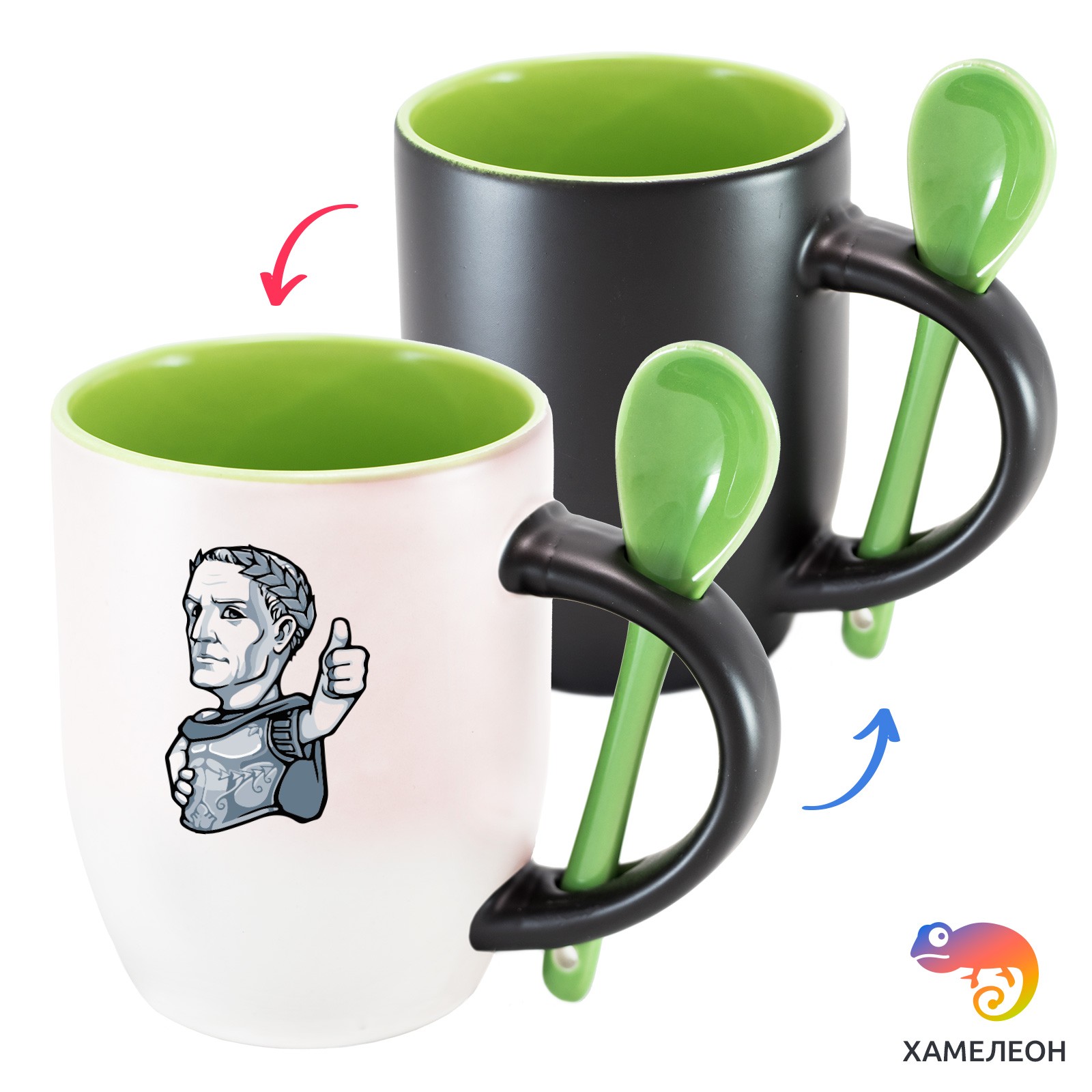 Кружка с принтом является отличным подарком коллеге, другу или самому себе ?Оригинальная кружка хамелеон Юлий Цезарь (TG) с ложкой приукрасит ваши будни или станет отличным подарком. Кружка изготовлена из высококачественной керамики, а специальный термопегментный слой позволяет ей менять цвет, в зависимости от температуры. Изначально кружка имеет черную заливку, которая становится белой, когда вы наливаете кипяток. Термопегменты становятся прозрачными, начиная с 50°C. Под черным пегментным слоем скрываются необычные рисунки, которые удивят многих.